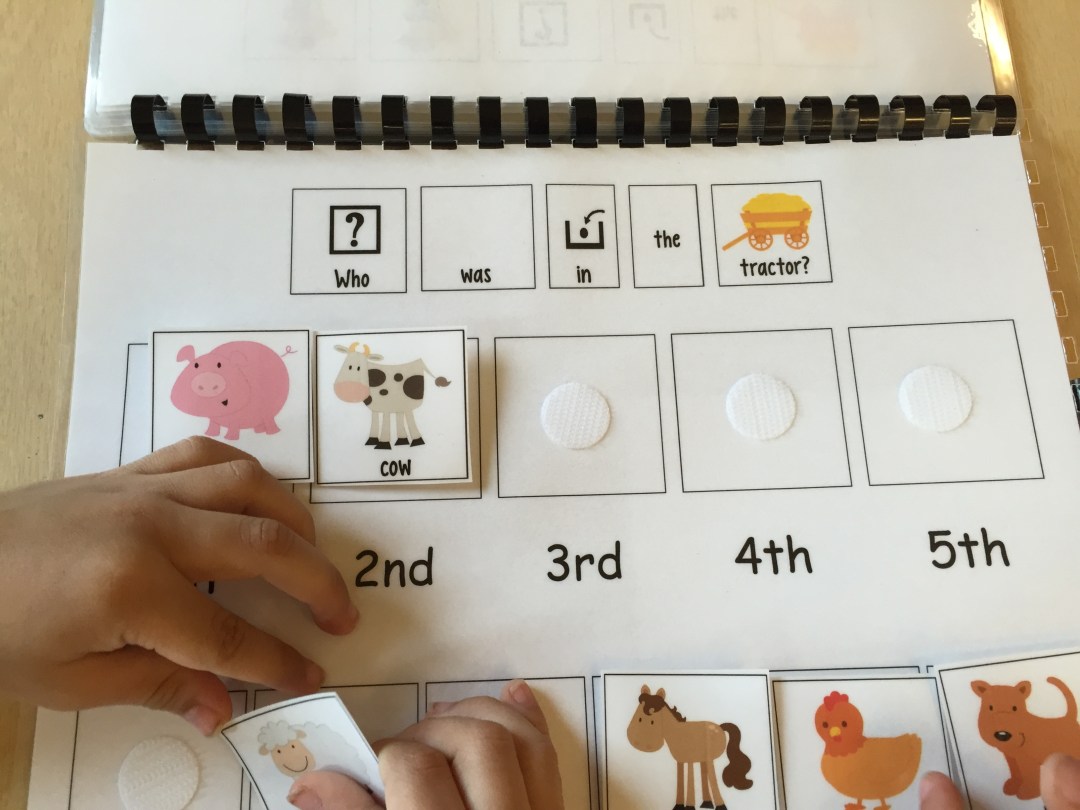 I continue to read the book in the same manner for each page. After I read the sentence on the bottom of the page I review the animals in the tractor. For example, after the student puts the sheep on the third page and we finish the sentence I point back to the tractor and say “first a pig, second a cow, “third a sheep”. I do this for each page to help the student remember the sequential order of the animals for the final page in the book.