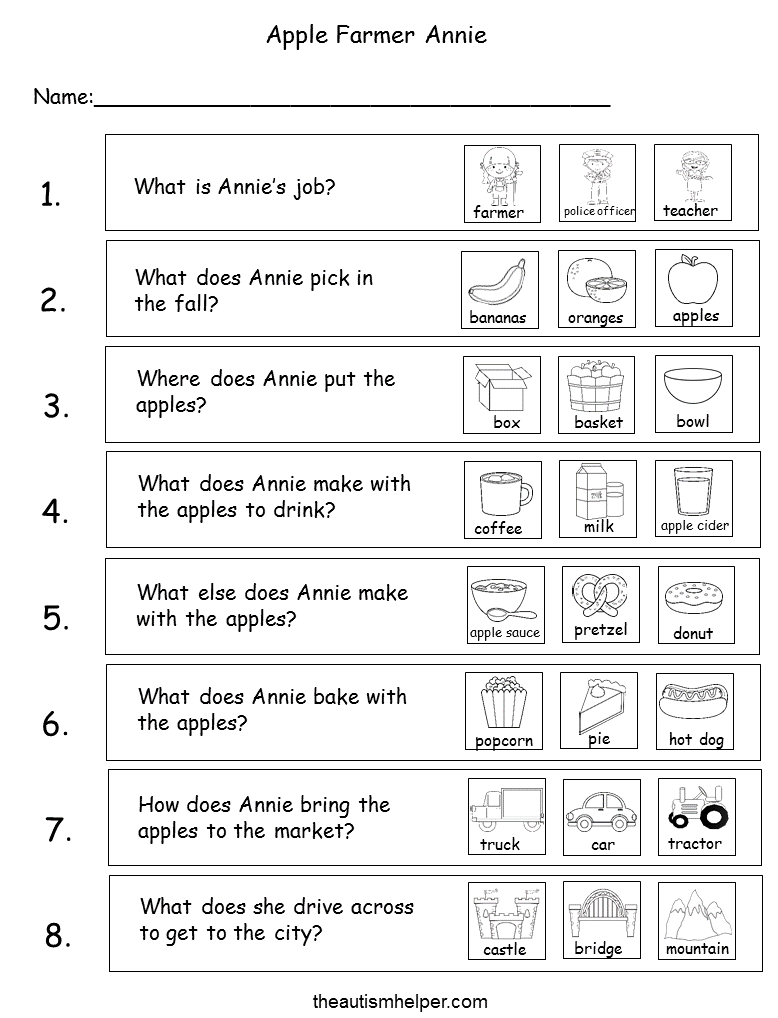 I have simple visual pictures to match each page in the book. I stop after each page and ask a question about that page. The student can select the correct picture to answer the question and place it in the book. For example, in the book “Apple Farmer Annie” I asked “who is the story about?”. The student can find the Annie picture and place it in the book.